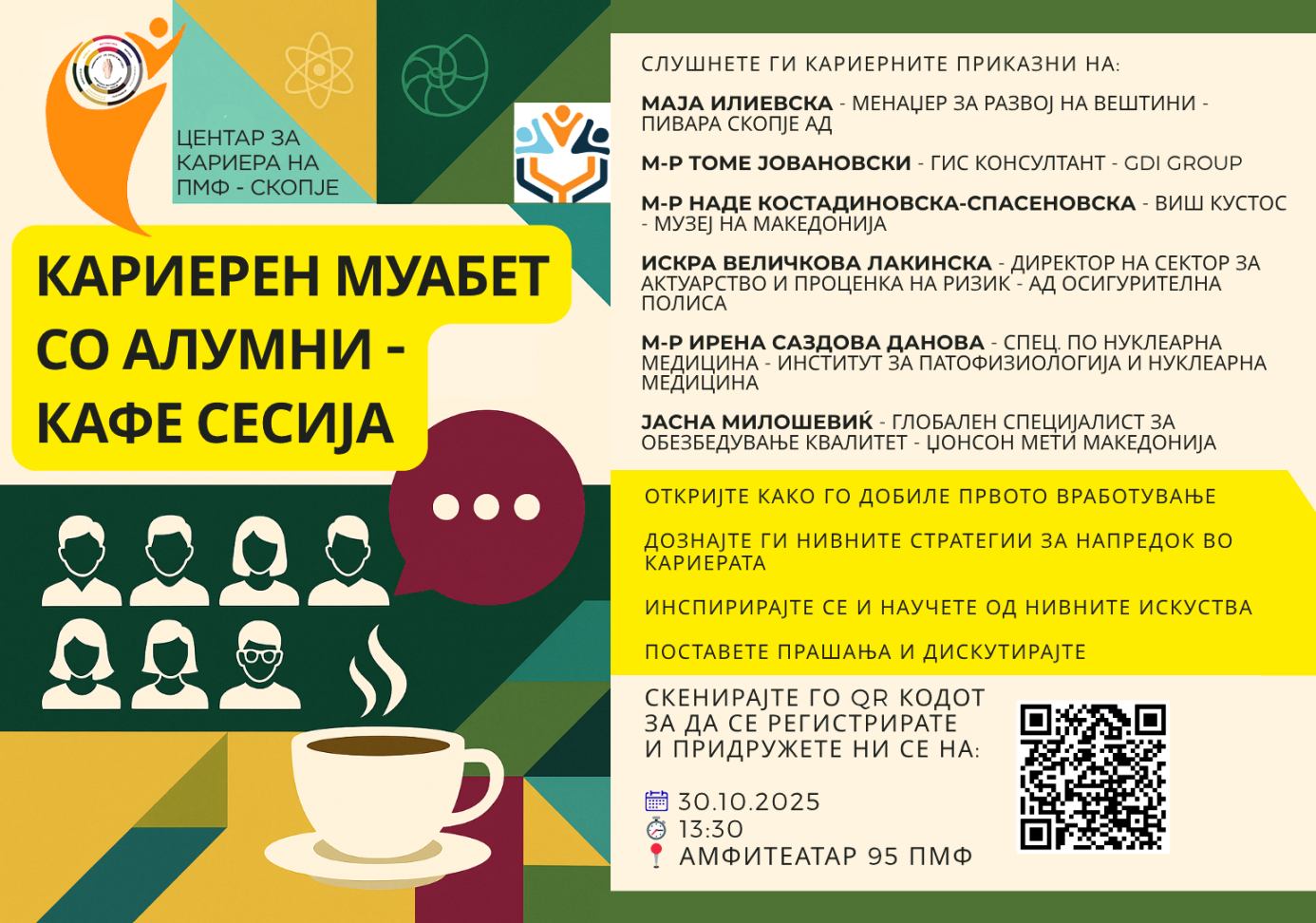Центарот за кариера при ПМФ – Скопје го организира првиот кариерен настан со алумни, каде што ќе имате можност да ги слушнете инспиративните кариерни приказни на наши успешни колешки и колеги – како го добиле своето прво вработување, кои биле нивните стратегии за напредок и што научиле на патот до успехот.